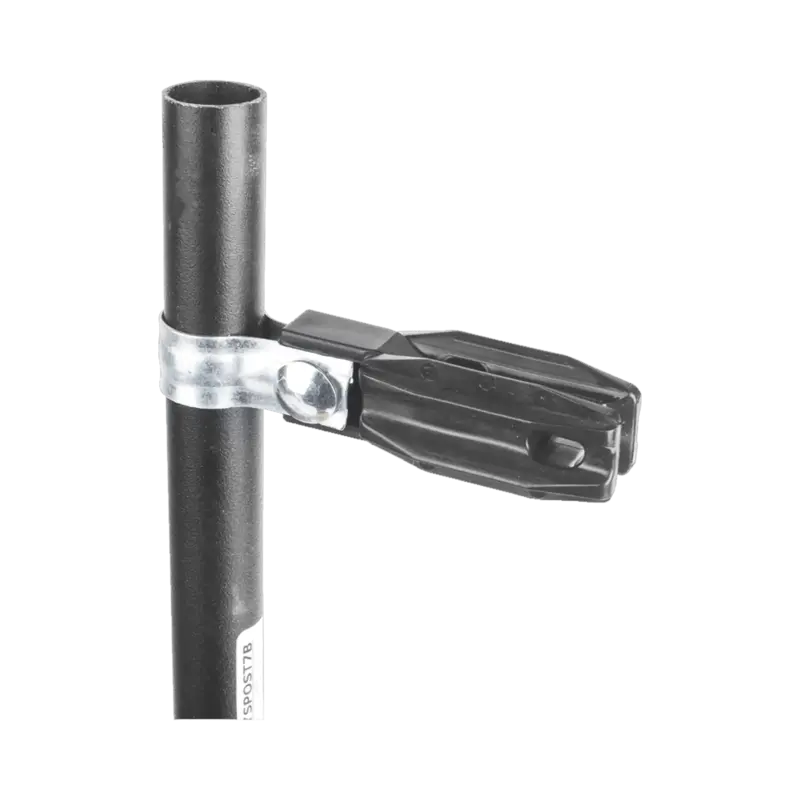 Aislador de paso o esquina con abrazadera de 1″ diametro para uso en poste de cerca electrica.