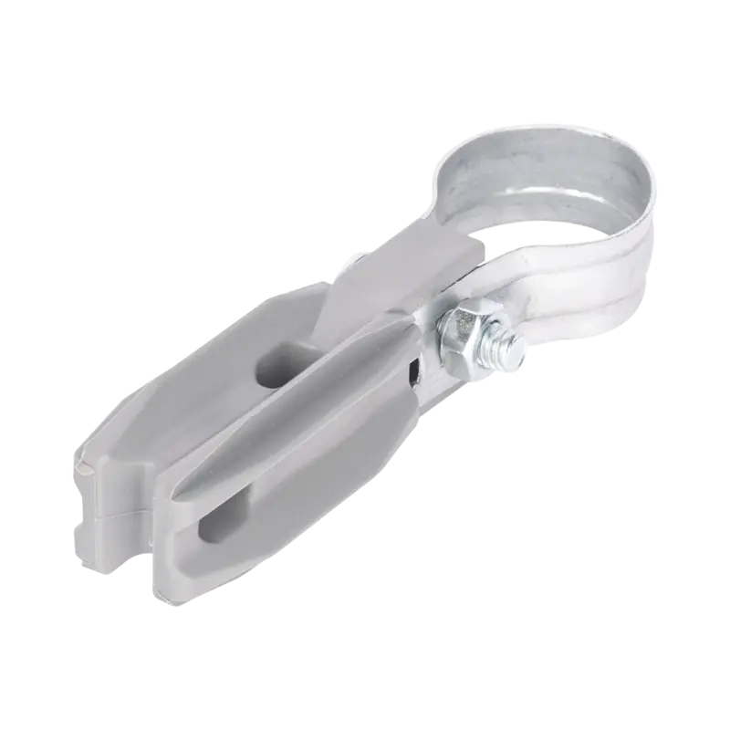 Aislador de paso o esquina con abrazadera de 1″ diametro para uso en poste de cerca electrica.