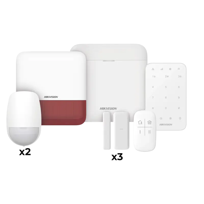 -AX PRO- KIT de Alarma AX PRO – Incluye: 1 Hub – 2 Sensores PIR – 3 Contactos Magnéticos mini – 1 Control Remoto – 1 Sirena Estrobo en color Rojo Inalámbrica Exterior -1 Teclado Inalámbrico – Wi-Fi – Compatible con Hik-Connect P2P