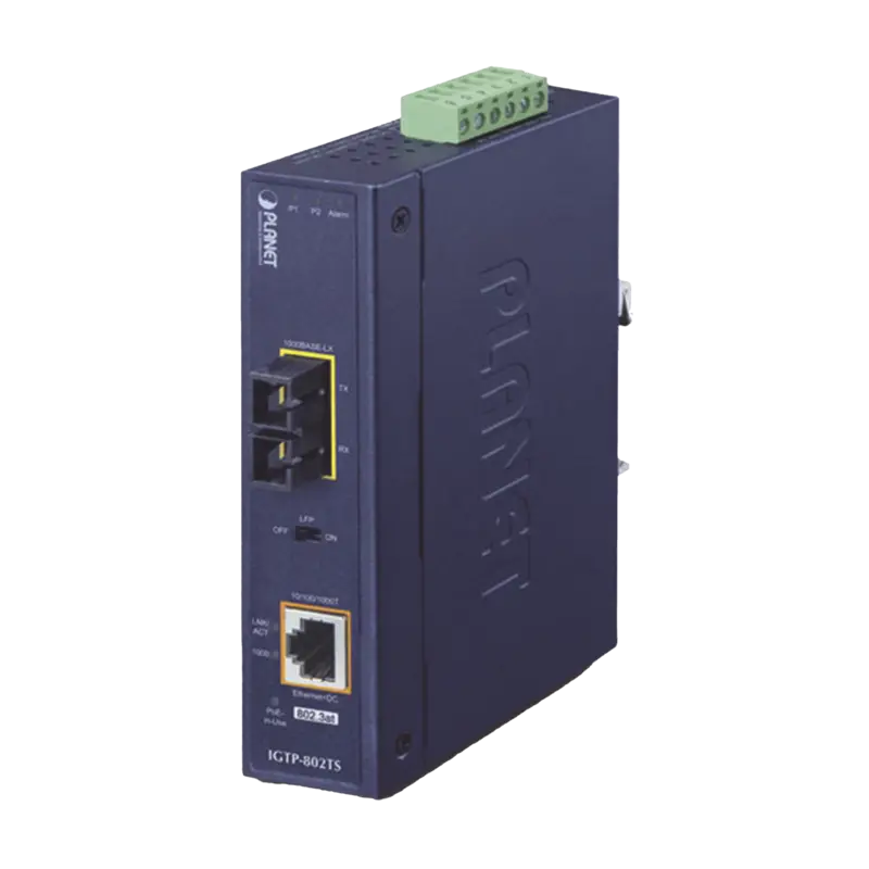 El convertidor de medios industrial Gigabit dePLANET IGTP-802TS (1000BASE-X a 10/100 / 1000BASE-T) con inyector 802.3at Power over Ethernet Plus (PoE +) para entregar hasta 30 Watts. Su puerto de enlace ascendente de fibra optica 1000BASE-X proporciona a distancias grandes altas velocidades y transmisiones de datos estables a una red central remota. El sistema de alimentacion especial y conveniente del IGTP-802TS admite entrada de alimentacion de 12 ~ 48 V CC o entrada de alimentacion de 24 V CA para redundancia de alimentacion y flexibilidad operativa.