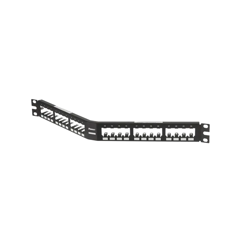 Panel de Parcheo Modular MiniCom Sin Conectores, Angulado, Totalmente Blindado, de 24 puertos, 1UR