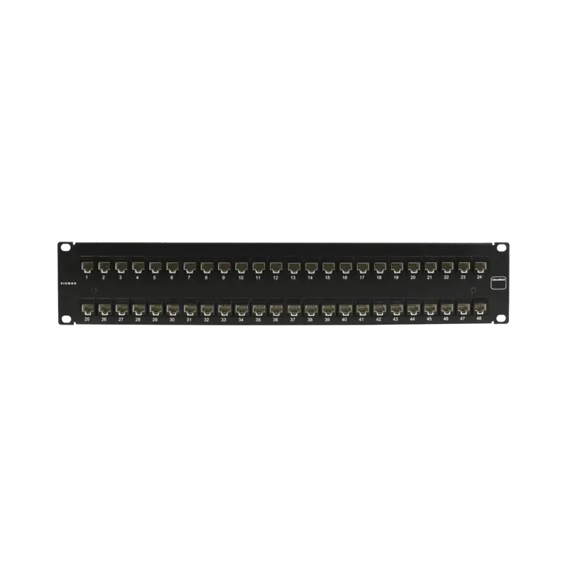 - Patch panel de 48 puertos con jacks precargados Cat5e.