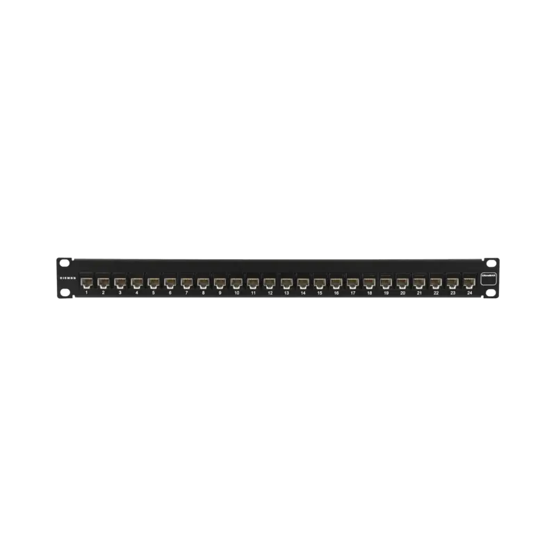 - Patch panel de 24 puertos con jacks precargados Cat6A.