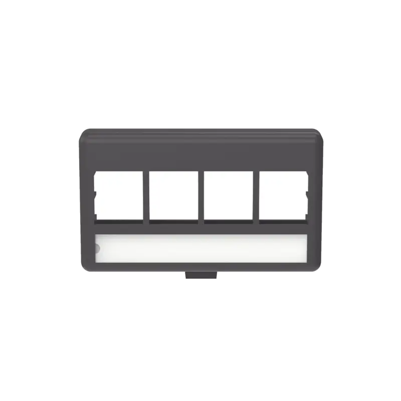 La placa frontal para muebles modulares Keystone acepta cuatro modulos Mini-Com. Se instala a una apertura de muebles de oficina estandar. Incluye un protector para etiquetas para una facil identificacion.