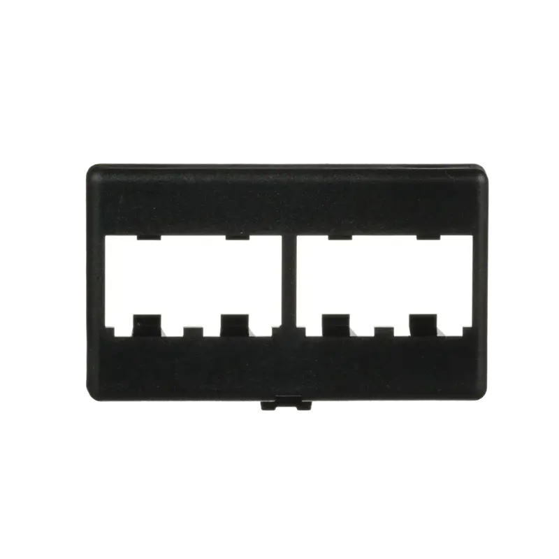 La placa frontal para muebles modulares Mini-Com® acepta cuatro modulos Mini-Com. Se instala a una apertura de muebles de oficina estandar. Se puede identificar con etiquetas adhesivas.