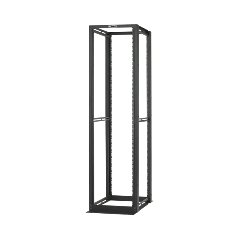 Rack de cuatro postes que cumple con los estandares EIA-310D y esta construido en acero capaz de aceptar equipamento de 19″ EIA. El metodo de contruccion del rack se asegura de una estructura electricamente unido para facilitar la conexion a tierra.