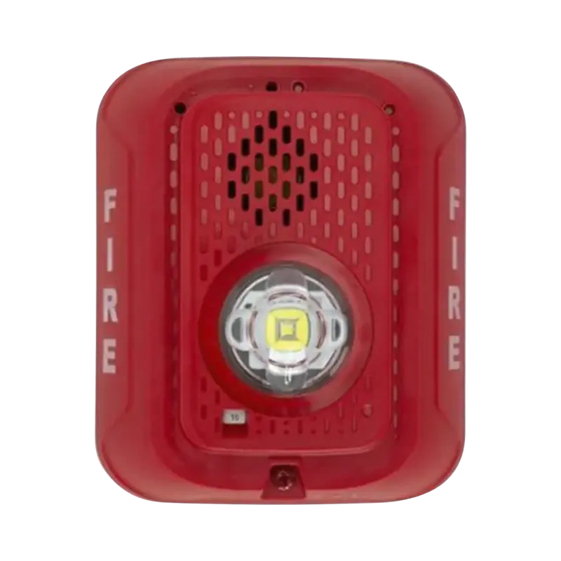 Sirena con Lámpara LED Estroboscópica – a 2 Hilos – Montaje en Pared – 24 Vcd – Configuración Estroboscópica Seleccionable – Texto en Inglés – Color Rojo