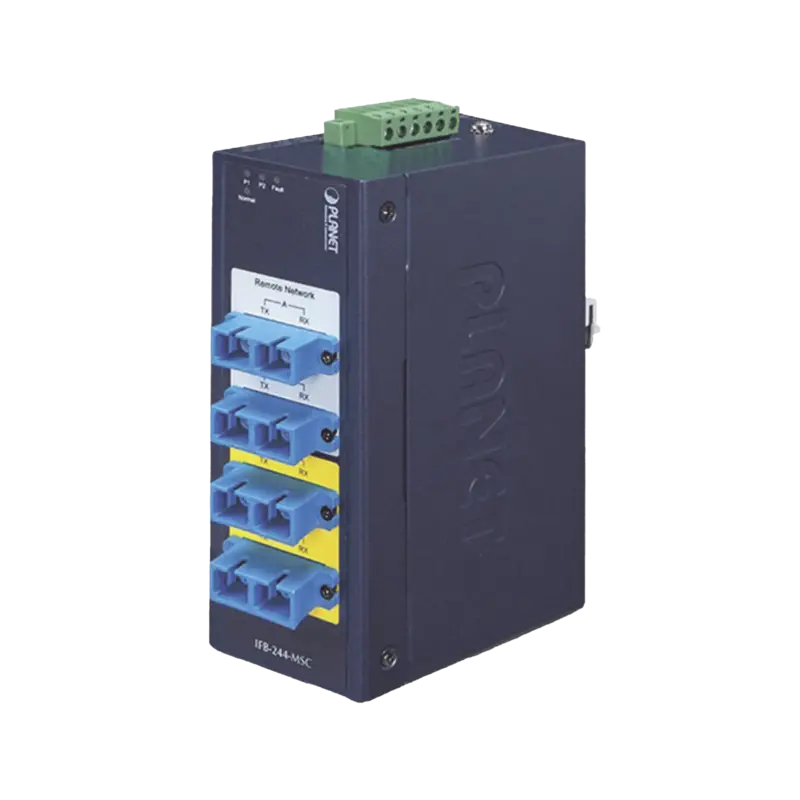 El interruptor de derivacion de fibra optica industrial de la serie IFB-244 se puede utilizar en redes opticas importantes y criticas donde no se toleran fallas en los enlaces de fibra, como en subestaciones electricas, estaciones de trenes y autobuses, sistemas de vigilancia IP, monitoreo de ferrocarriles, sistemas de comunicacion y fabricas. automatizacion.