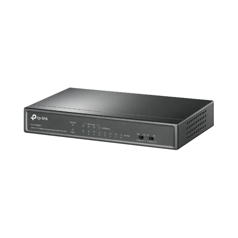 Switch PoE No Administrable de Escritorio – 8 puertos 10-100 Mbps – 4 puertos PoE af – Presupuesto 41 W – Modo extensor PoE hasta 250 metros – Calidad video prioritaria